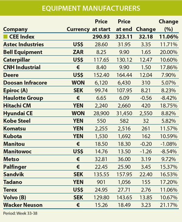 Hitachi Construction Machinery e CNH Industrial sono stati i successivi maggiori produttori, in rialzo del valore delle azioni rispettivamente del 18,75% e del 17,86%.