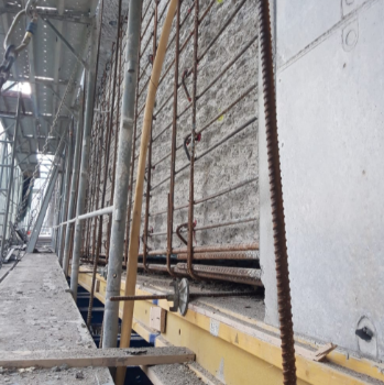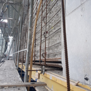 Vengono così soffiati i fori con resina bicomponente e poi si interviene sull’armatura con ferri di diametro del 16; poi avviene l’incamiciatura delle pile con ferri da 40 e la gettata di differenti tipologie di cemento, anche pompato in verticale”.
