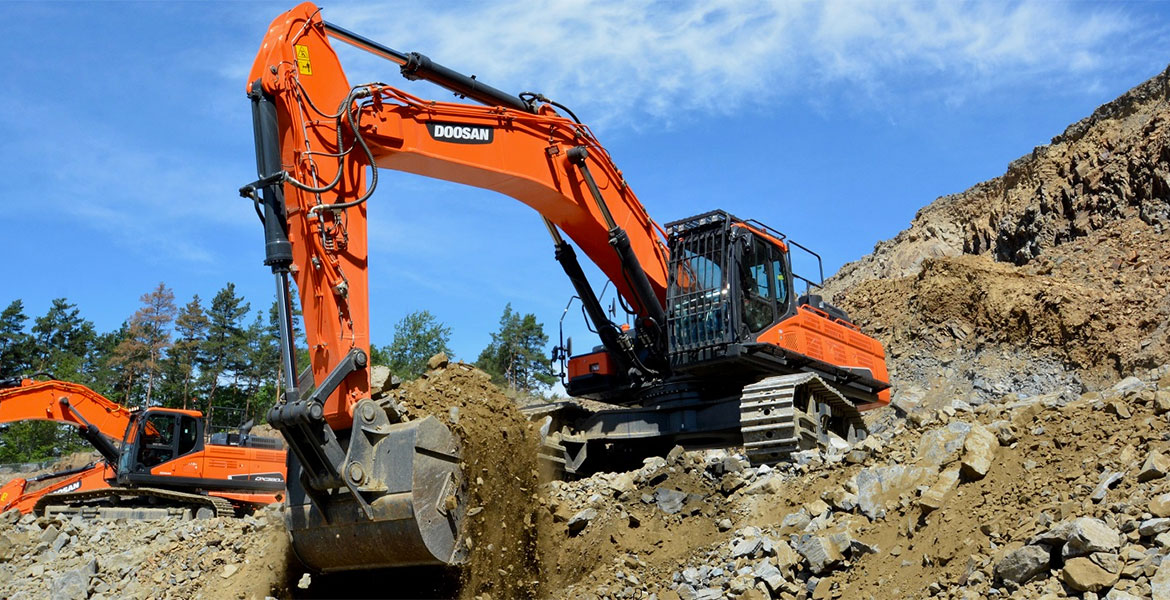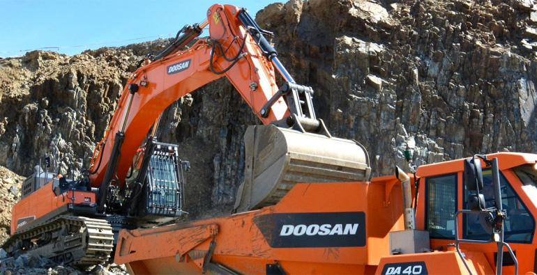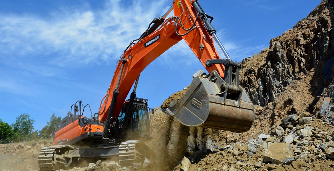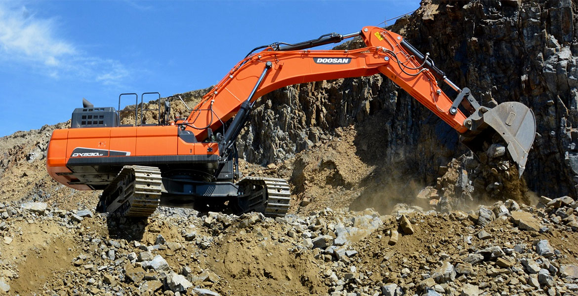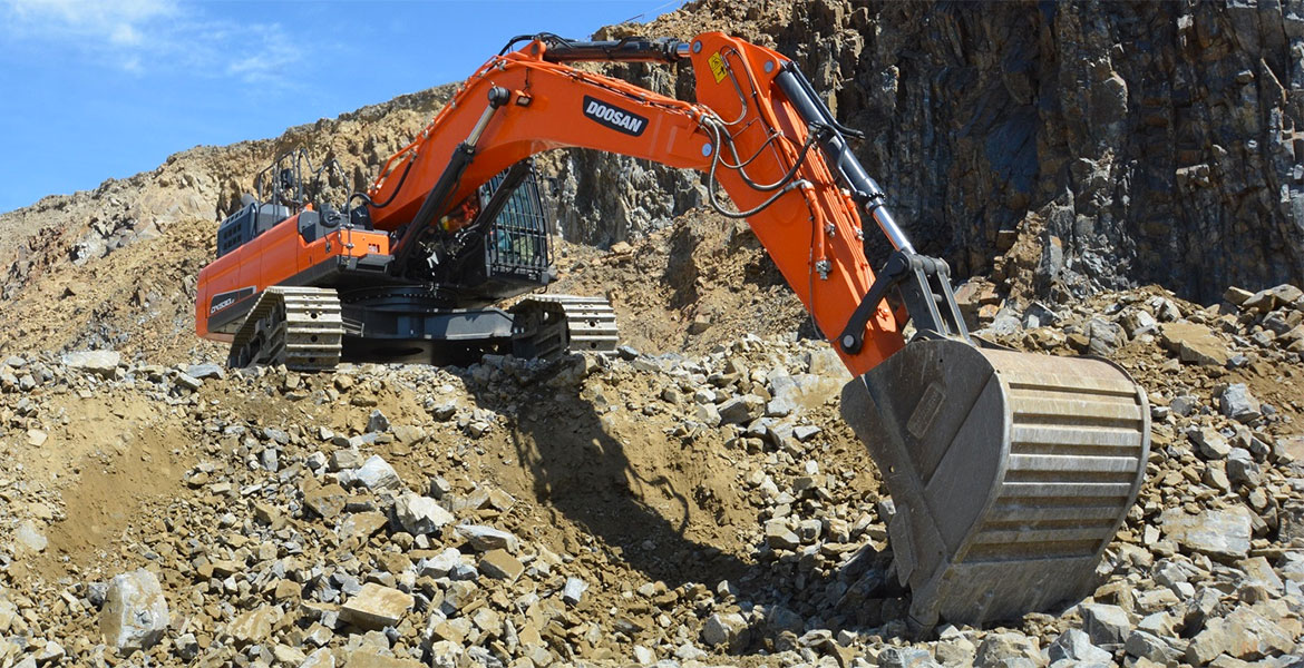 Una roccia dura e abrasiva che caratterizza la cava in cui, durante i "Doosan Quarry Days" abbiamo preso contatto con il DX530 LC-5, escavatore idraulico del costruttore coreano che, con i suoi 52.100 kg di peso operativo e una potenza di 283 kW (379,5 CV) erogati dal motore Scania DC13, si colloca al vertice dell’offerta di escavatori idraulici disponibili per il mercato europeo.