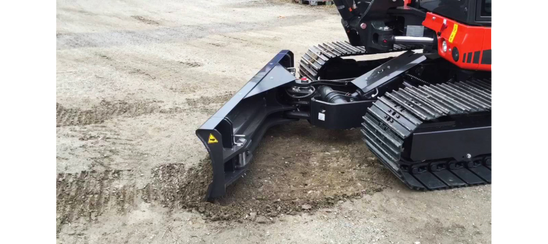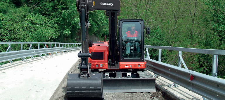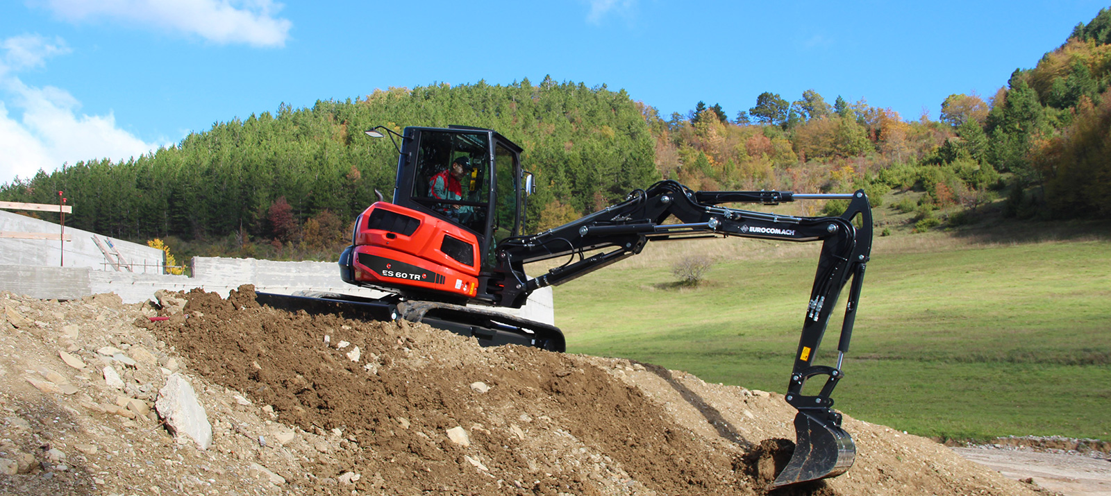 Parliamo innanzitutto del miniescavatore da ES 60 TR con lama angolabile e oscillante; si tratta di una macchina dal peso operativo di 6,05 tonnellate, spinta da un Kubota da 2,615 litri che eroga una potenza di 33,8 kW. Oltre alle prestazioni di tutto rispetto (forza di strappo 4.500 daN, forza di penetrazione 2.800 daN), vogliamo portare la vostra attenzione sulla lama, soluzione che Eurocomach aveva presentato con estremo successo lo scorso Bauma. La lama è ad azionamento idraulico e può essere angolata di 25° in entrambe le direzioni; la lama, come dicevamo è anche oscillante di 10° (da entrambe le parti): entrambi i movimenti sono azionati da mostrine elettroidrauliche proporzionali integrate sul servocomando della lama. Dotata di prolunghe e di lama salvatagliente supplementare può davvero fare la differenza in fatto di produttività operativa.