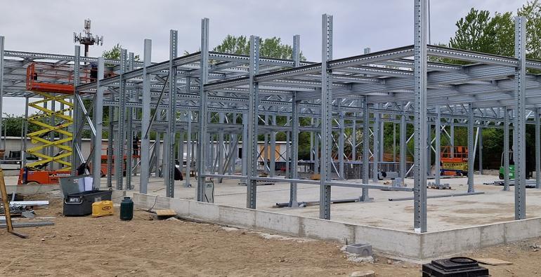 L'edificio mono-piano è stato realizzato con la tecnica della costruzione a secco, che prevede l’unione di più componenti in ferro fissate tra loro senza l’utilizzo di cemento o mattoni.