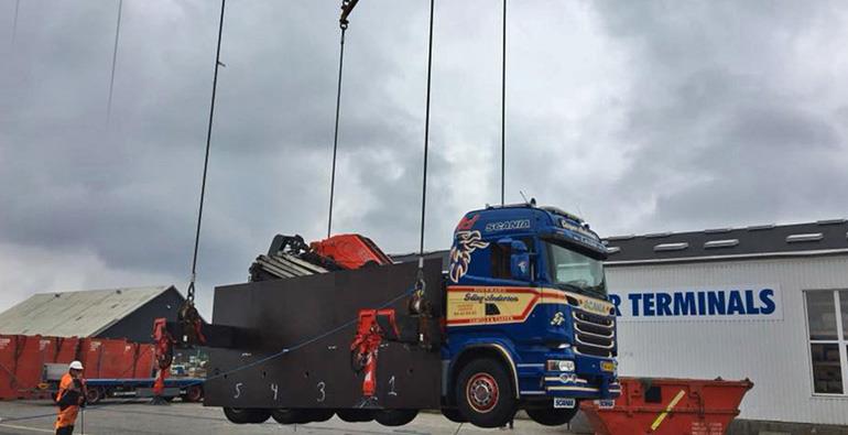 Allestito dal distributore locale Fassi Kraner ApS – autore delle suggestive foto – il camion una volta caricato su una nave, ha preso il largo verso la piattaforma, dove è stato utilizzato per sostituire il verricello di una delle gru fisse che vi sono installate.