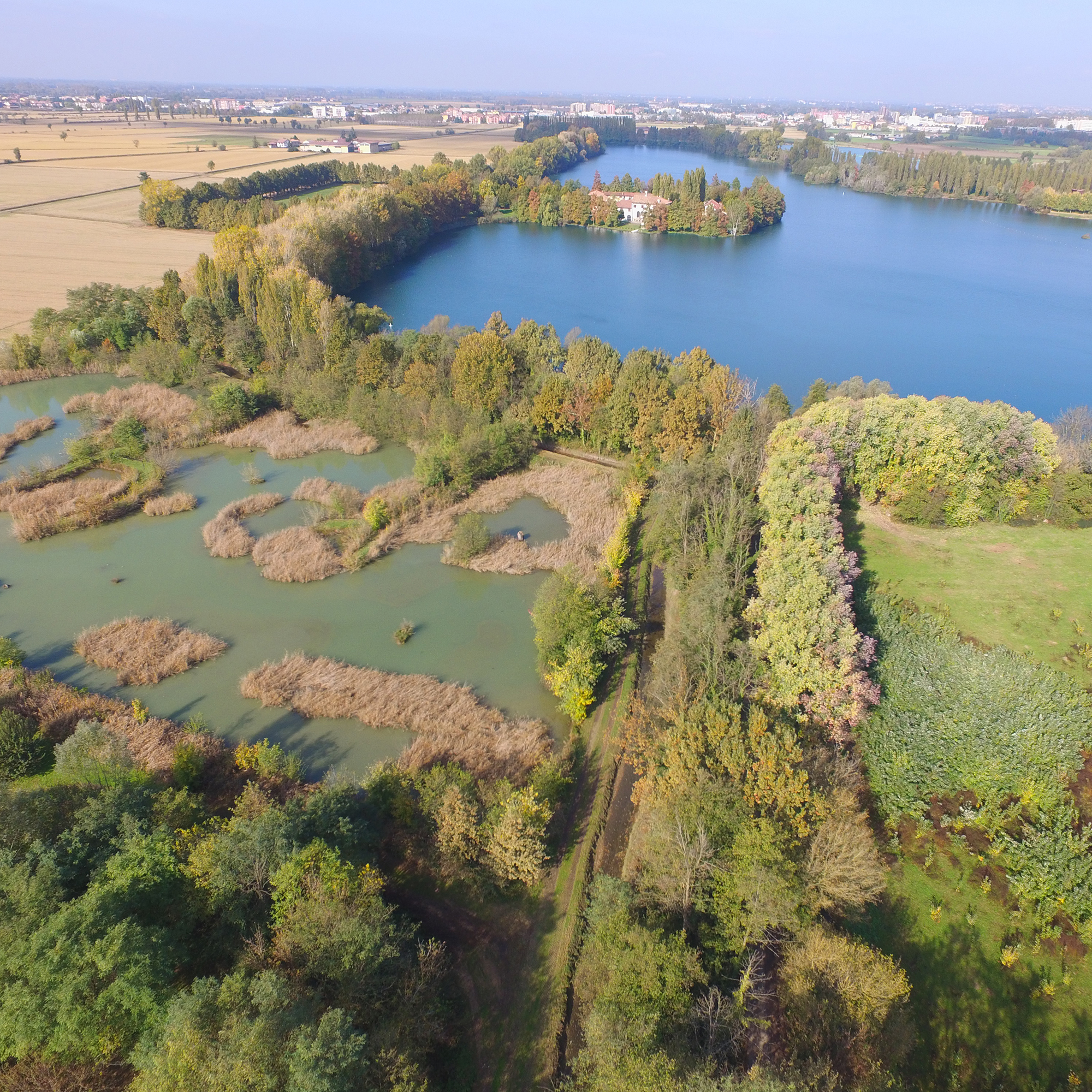 100 ettari, all’interno dei quali oggi si trovano tre laghi balneabili, prati verdi a filo acqua, filari di alberi, brani importanti di pianura agricola abilmente ricostruita.