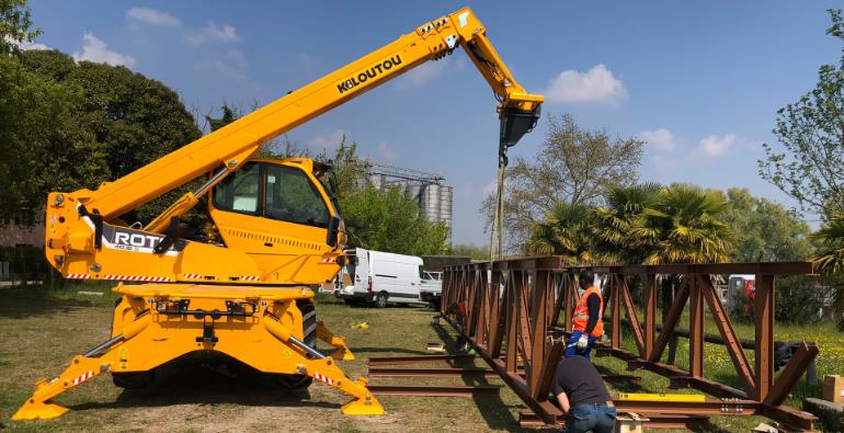 Per spostare gli elementi è stato utilizzato un sollevatore telescopico Merlo Roto 40.16S, equipaggiato con un gancio su zattera, e noleggiato alla Socomet da Kiloutou.