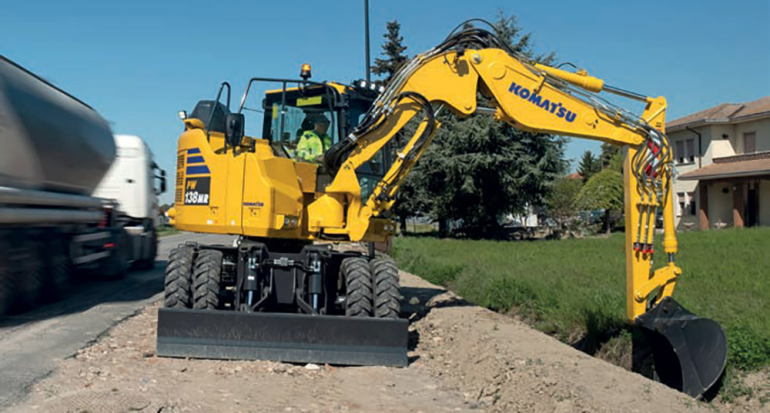 escavatore gommato Komatsu PW138MR-11, versatile e maneggevole, adatto sia a lavori infrastrutturali che a cantieri civili. Non mancano anche altre pale gommate, come la