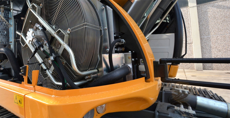 Con l'R920 Compact, così come con gli altri escavatori della propria gamma, vale lo stesso principio: accoppiamento snello fra motore e pompe, dimensionamento ottimale dei distributori per limitare al massimo le perdite di carico, accurato dimensionamento del motore idrostatico della ventola per assorbire meno potenza possibile.