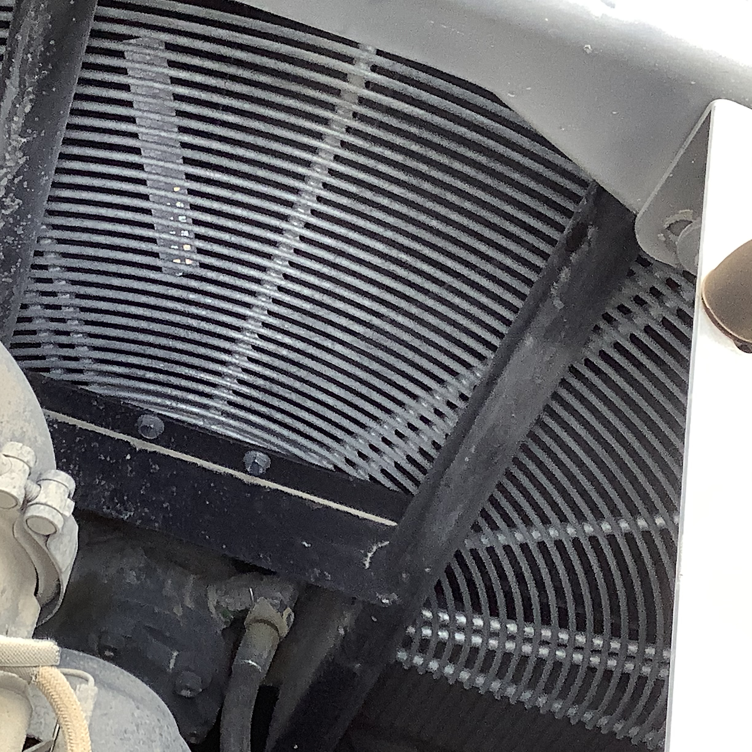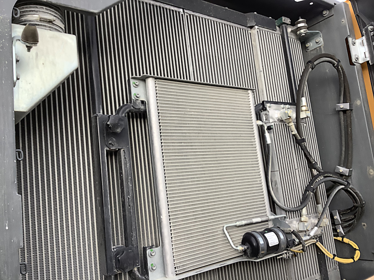 L’ultimo vano, che nasconde il lato caloroso di quasi la totalità degli escavatori, contiene il pacco dei radiatori del liquido di raffreddamento, dell’olio idraulico, dell’aftercooler dell’aria proveniente dal turbo, del piccolo radiatore del condizionatore e di altri servizi. Classico, ma buono il posizionamento e l’accessibilità per mantenerli in perfetta efficienza!
