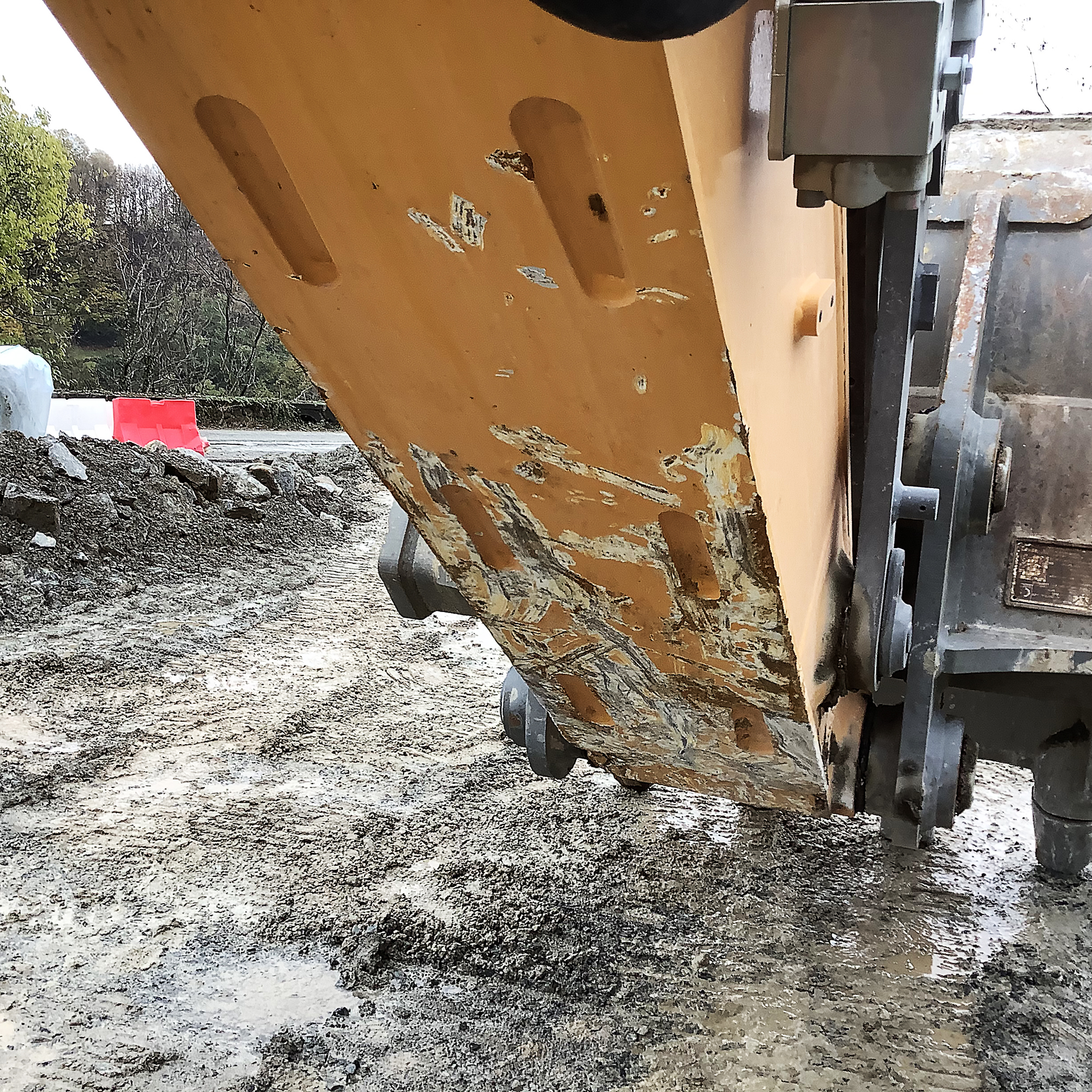 In quella zona non trovo escavatore che non porti i segni di colpi e strusciate contro materiale sempre molto duro e poco incline alle carezze….mi consolerò perché sicuramente il costo del ricambio sarà inferiore alle classiche lamiere pesanti e spesse.