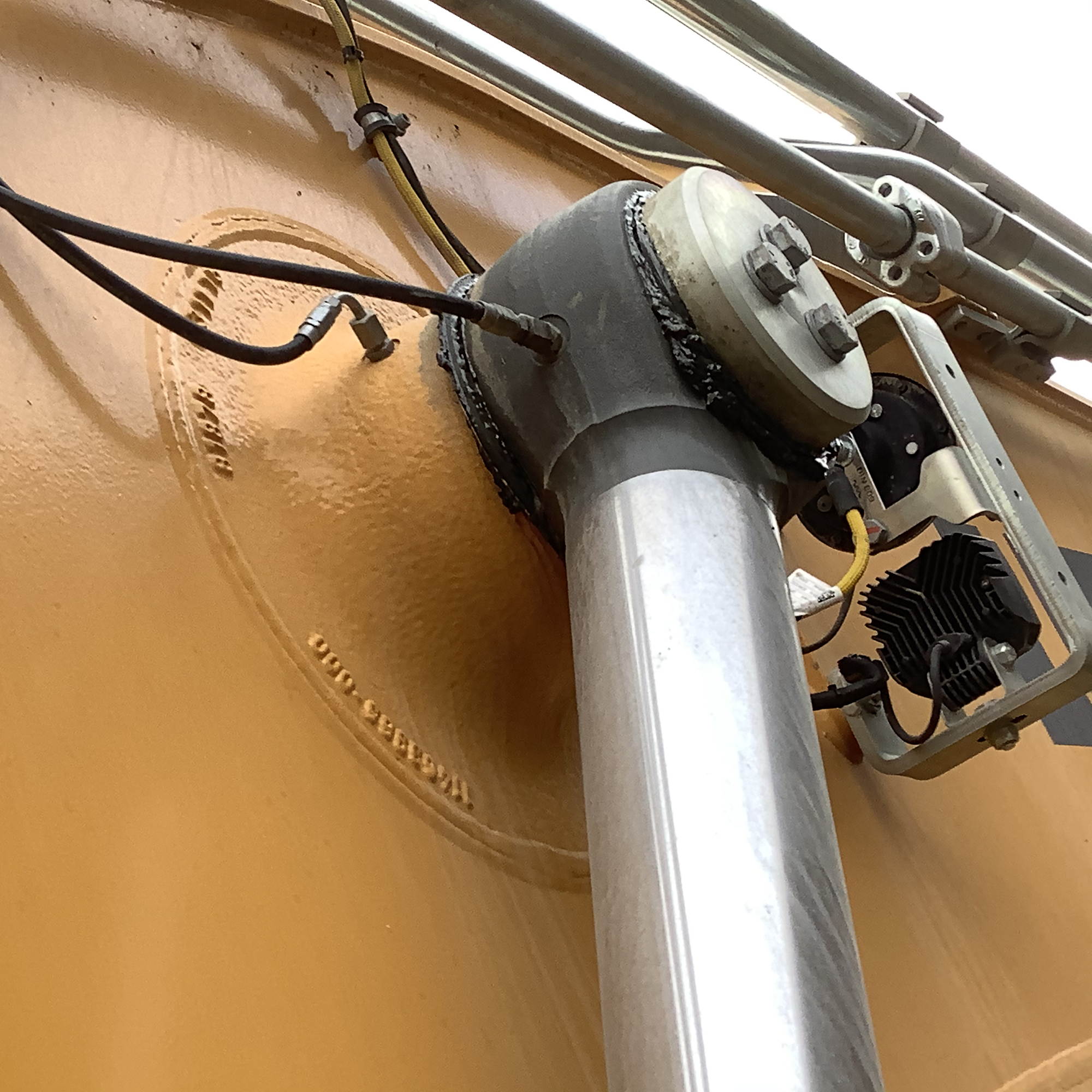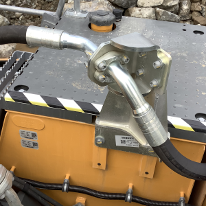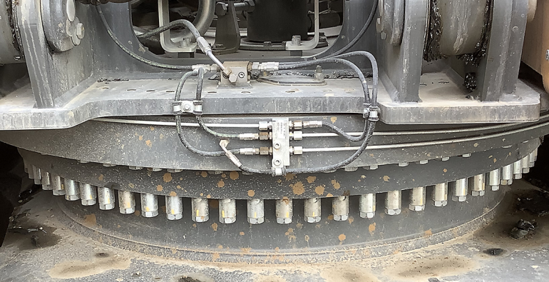 Comodamente ospitato nella coperta del mezzo, ho accesso al vano comprendente giunto idraulico inferiore, pulito e semplice da controllare; accanto vediamo l’importante motore di rotazione da 8,6 giri/min, in grado di sviluppare la notevole forza di 117 kNm con freno negativo integrato; si vedono anche una serie passaggi delle tubazioni ben disegnati che portano olio ai vari utilizzatori sul braccio caricatore.