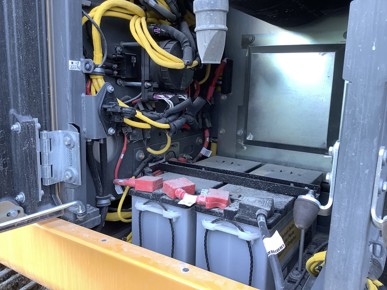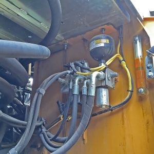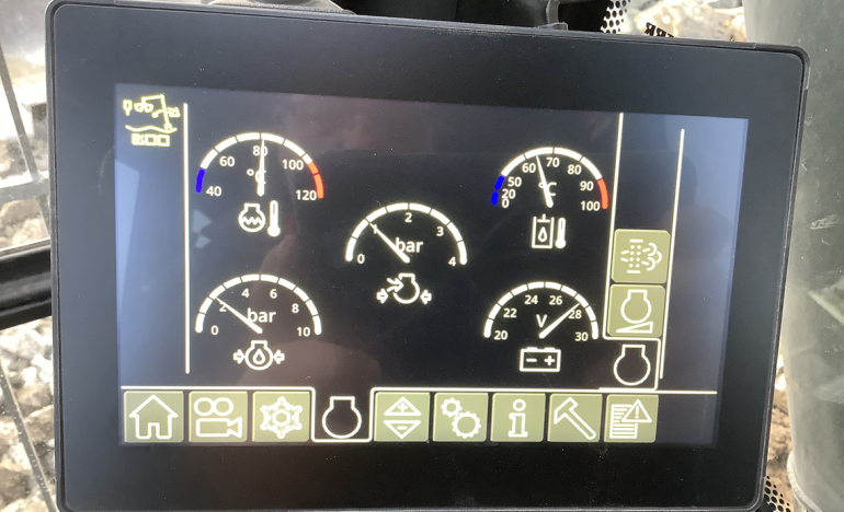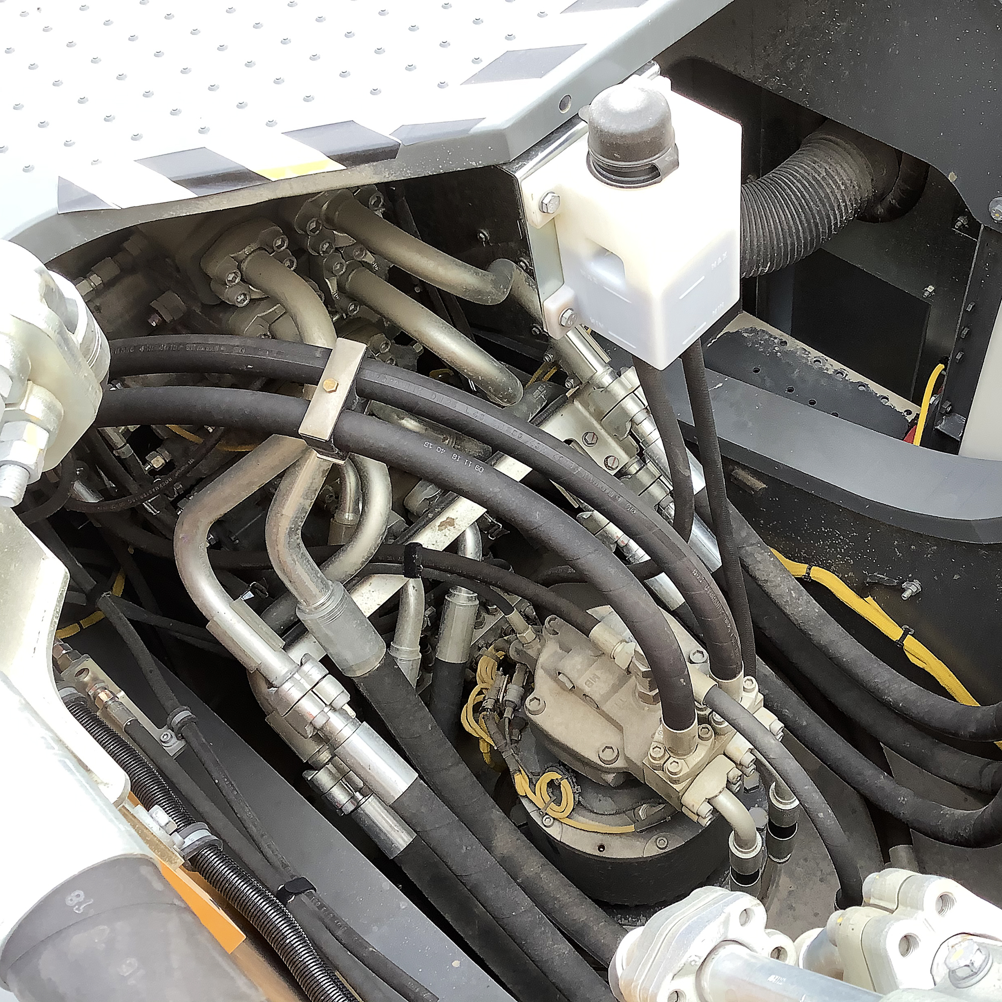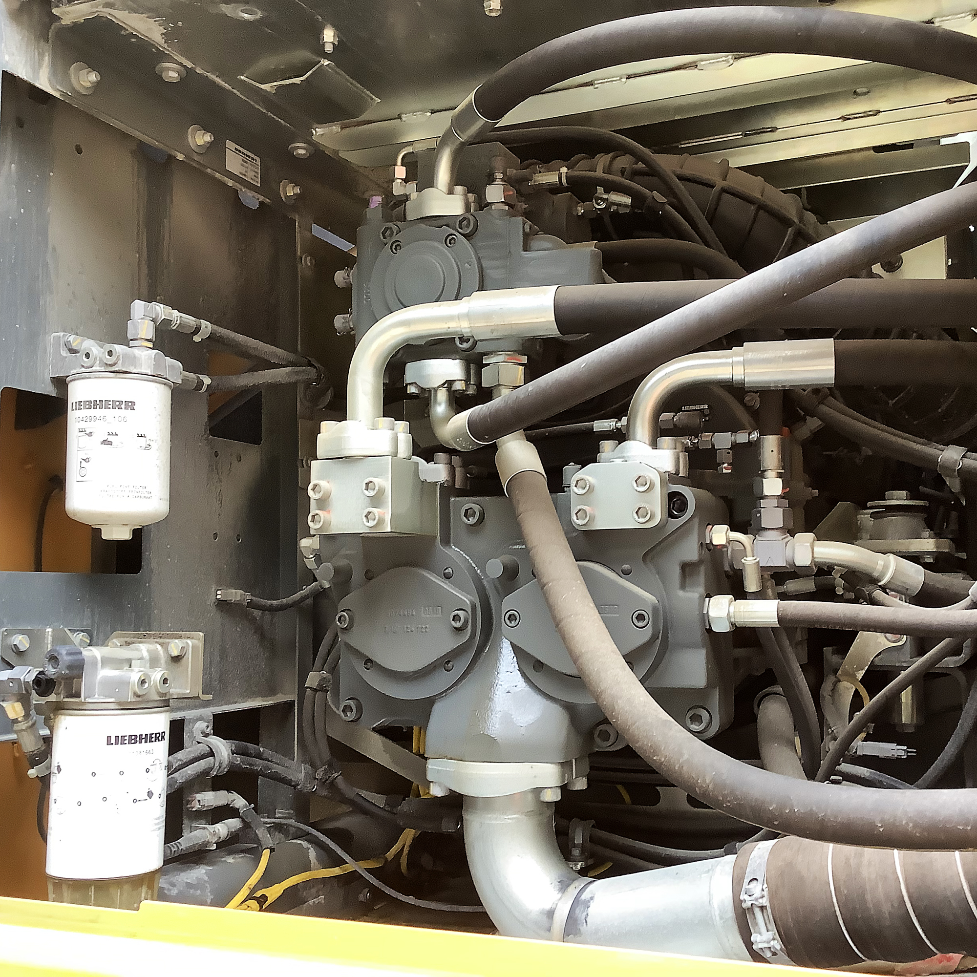 Il mio personale approccio parte sempre dall’importantissimo vano pompe: in bella vista due gruppi pompanti principali da 315 l/min ognuno (con una pressione di esercizio di 380 bar), di generose dimensioni e un terzo gruppo superiore dedicato alla rotazione da 205 l/mine 400 bar, il tutto condito da filtri di facile sostituzione; ben posizionato, immediatamente visibile e di semplice accesso il livello ottico di controllo dell’olio idraulico.