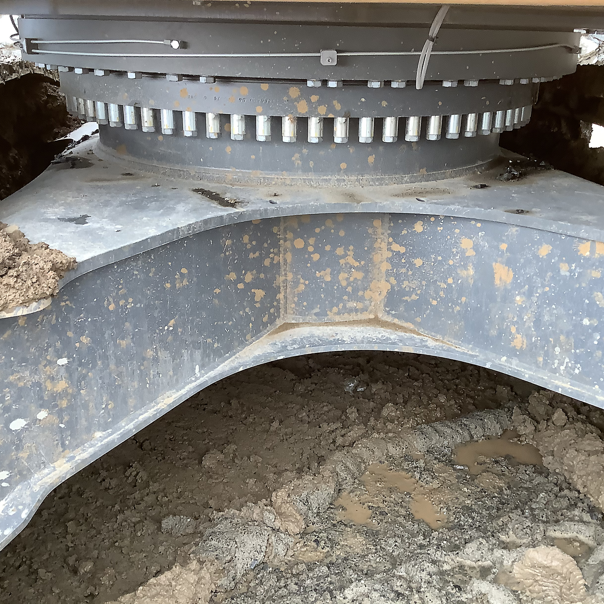 Robusta l'articolazione fra braccio e penetratore, con elementi in fusione e un'interessante soluzione di alleggerimento frutto dello studio di Liebherr su modelli a elementi finiti