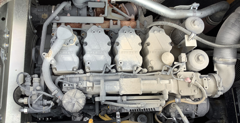 Sotto il cofano pulsa un motore Liebherr da 4 cilindri: 220 kW a 1800 giri, con coppia massima sviluppata a 1.350 giri e pari a 1,421 Nm