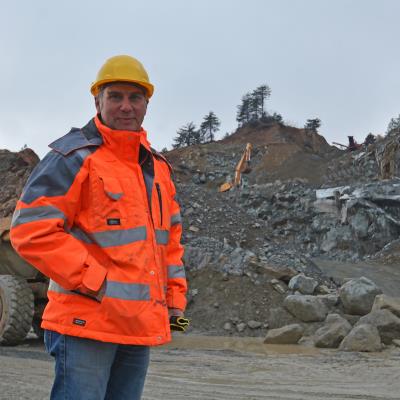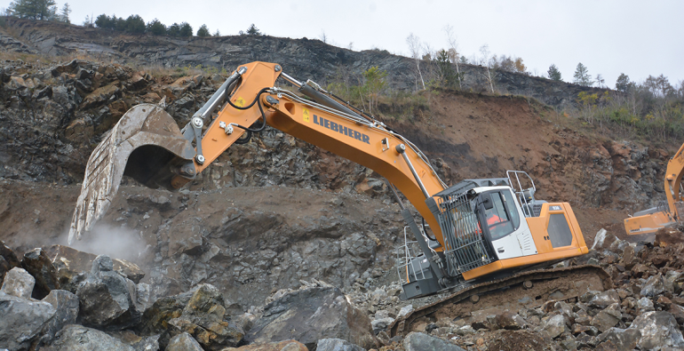 Terminato un rapido ed interessante tour della produzione (ordinatamente affollato di camion in carico e scarico!!! Ottimo!!), ci siamo spostati in un’area non estrattiva, ma dove sono impegnati in un importante sbancamento due escavatori Liebherr tra cui il “nostro” nuovissimo R938-8 stage V, in allestimento con benna , i suoi collaudati fratelloni R944 C allestito con benna roccia e l’ R944 B che monta invece il martello idraulico per frantumare e scalzare la roccia in una zona particolarmente impegnativa a livello geologico.