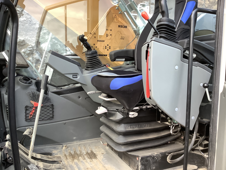 La salita è agevole grazie alla scaletta e alle maniglie ben posizionate, il sedile risulta assolutamente comodo e ampiamente regolabile e inoltre si avvale di un innovativo sistema di smorzamento sia verticale sia longitudinale, che rende molto gradevole la permanenza in cabina. I comandi manuali, classici Liebherr, sono sempre all’altezza per ergonomicità e regolazioni autonome rispetto al sedile.