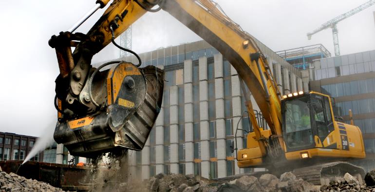 Il vantaggio è stato doppio: nessun costo di trasporto e smaltimento, e recupero immediato del materiale, riutilizzato in questo caso per la costruzione di un nuovo complesso di otto piani. Inoltre con la benna frantoio è riuscita a raggiungere il cantiere attraverso le uniche via di accesso, vecchi vicoli molto stretti.