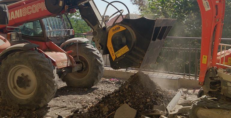 Quattro diversi modelli da installare a seconda del peso della macchina operatrice, trasformano il sollevatore telescopico in un vero frantoio a mascelle per frantumare e ridurre di granulometria il materiale inerte direttamente sul posto.