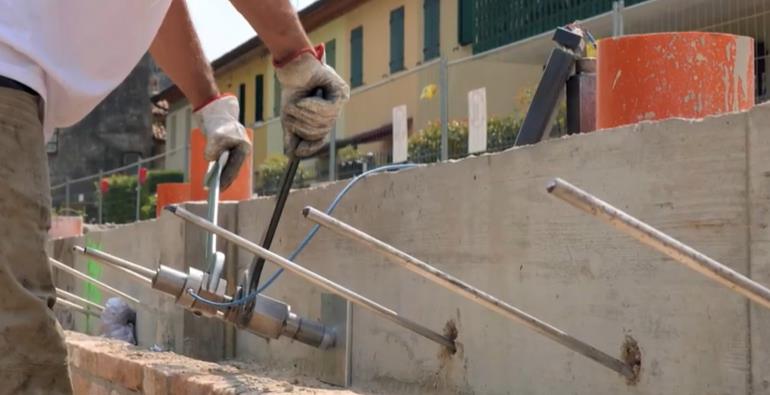 Per rinforzare il muro si è utilizzata la tecnologia Microanchors di Uretek, realizzando una fila di ancoraggi costituiti da chiodi in acciaio iniettati con resine espandenti.