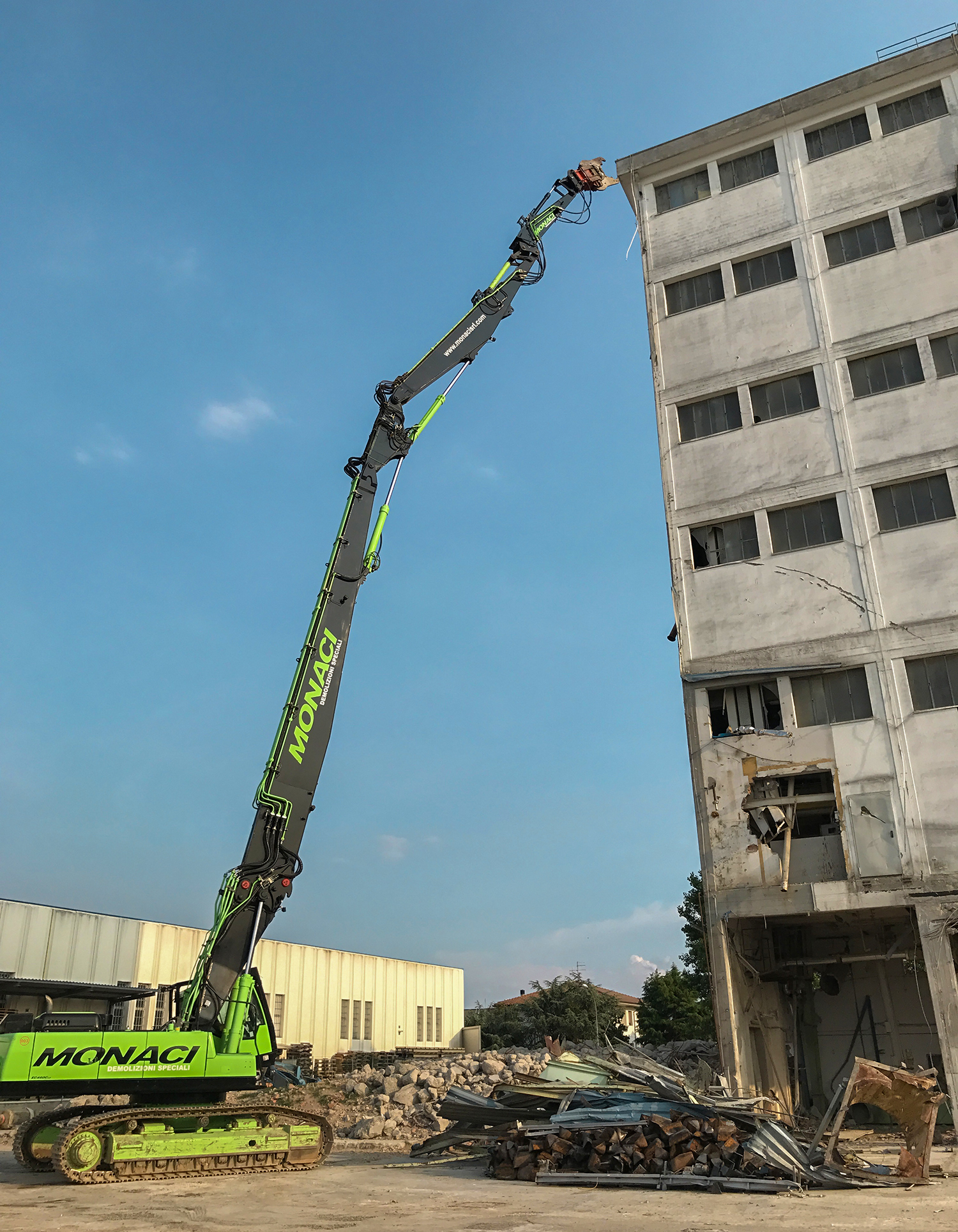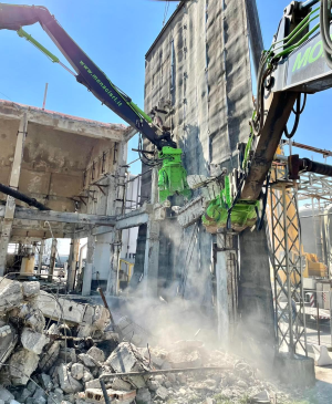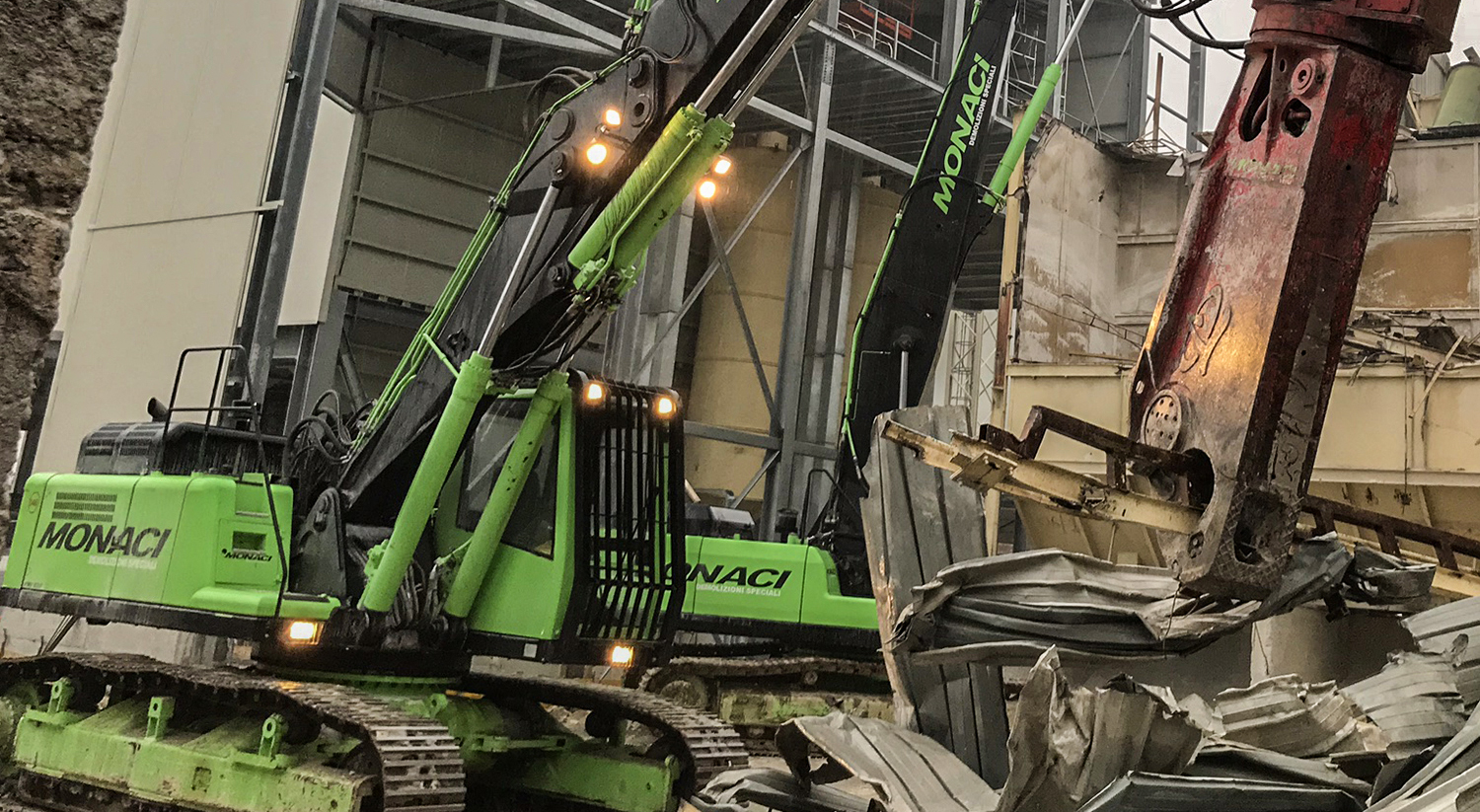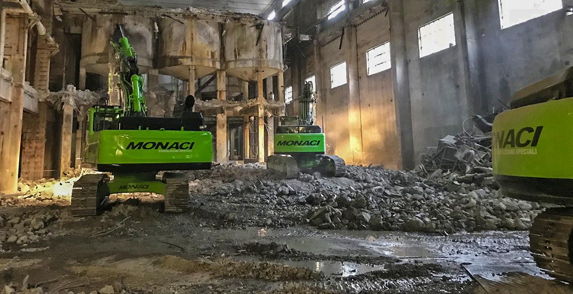 Demolizione di precisione con pinze montate sull’escavatore (credits, Monaci Demolizioni)