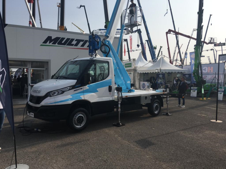 Ieri al GIS di Piacenza Multitel Pagliero ha presentato l'ultima grande novità tra il suo parco macchine: la piattaforma autocarrata telescopica allestita su autocarro con PTT da 3.500 kg Iveco e-Daily 35S10 Full Electric con altezza di lavoro di 16,2 m, sbraccio massimo orizzontale di 11,20 m e portata di 80 kg e di 7,40 m con portata di 250 kg.La rotazione della torretta di 400° e la cesta autolivellante da 1,40x0,70x1,10 m con rotazione 90°+90°, permettono all’operatore di aggirare eventuali ostacoli e di posizionarsi con precisione sull’area di lavoro. La MT 162 Axon assicura pari prestazioni rispetto alla versione con motore termico.