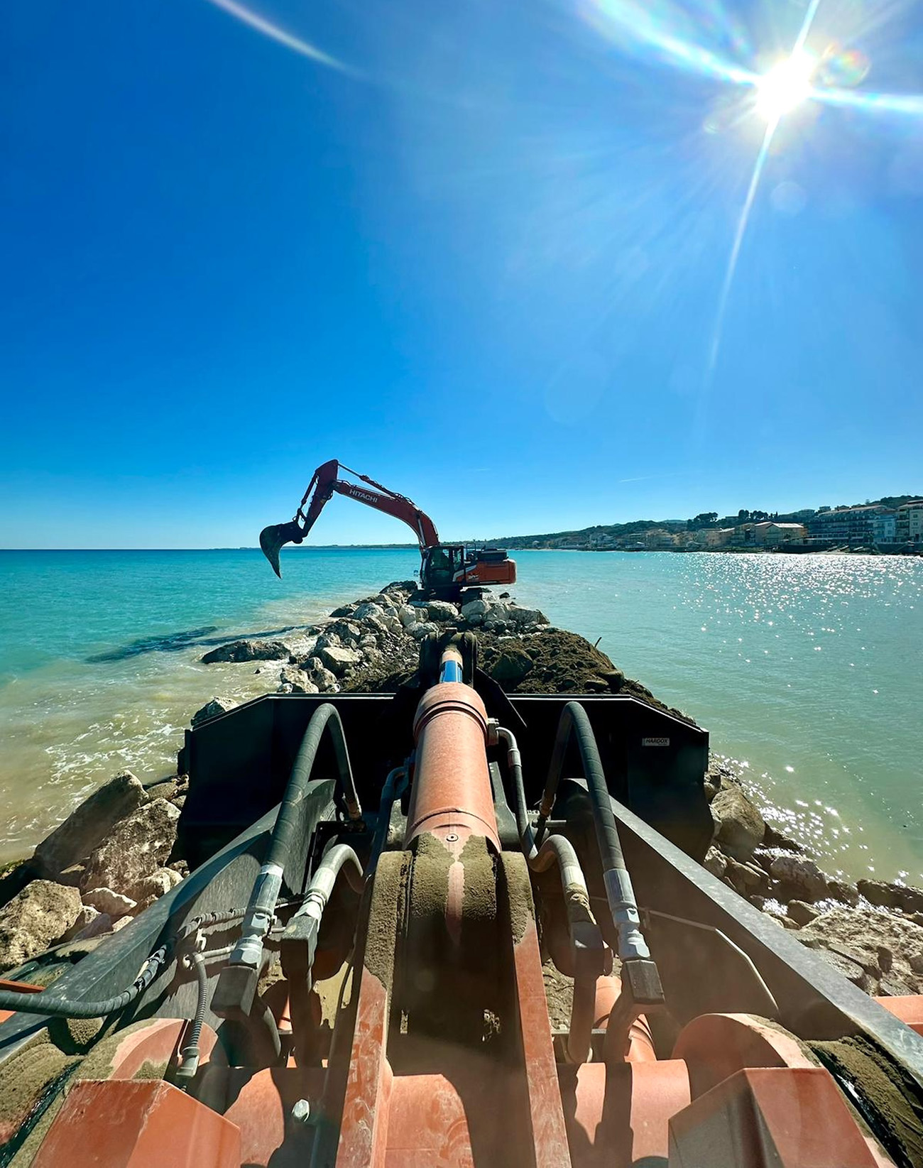 In cantiere sono stati impiegati escavatori Hitachi ZX300, utilizzati sia per la preparazione del sottofondo sia per il posizionamento dei massi destinati alla realizzazione delle scogliere. Le macchine hanno operato dalla battigia e direttamente in acqua, affrontando condizioni che richiedono componenti affidabili, idraulica precisa e ottima visibilità, essenziali per la corretta posa dei materiali e la formazione di strutture di difesa durevoli.