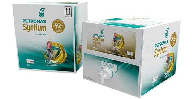 Petronas ha rivisto ogni parte del ciclo di vita dell'imballaggio del prodotto, dalla creazione allo smaltimento, con l’obiettivo di progettare un'alternativa sostenibile.Come risultato, la confezione di cartone Petronas Syntium BIB è certificata UN e quindi conforme a tutte le norme di trasporto per l'imballaggio e la spedizione di merci pericolose - una certificazione non comune nel settore dei lubrificanti.