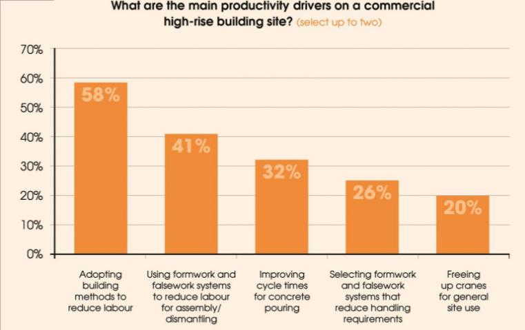 Un sondaggio condotto su oltre 135 appaltatori e consulenti di ingegneria in tutto il mondo, condotto dal gruppo KHL e sponsorizzato da RMD Kwikform, ha rilevato che i due fattori con il punteggio più alto nell'aumentare la produttività sono stati l'