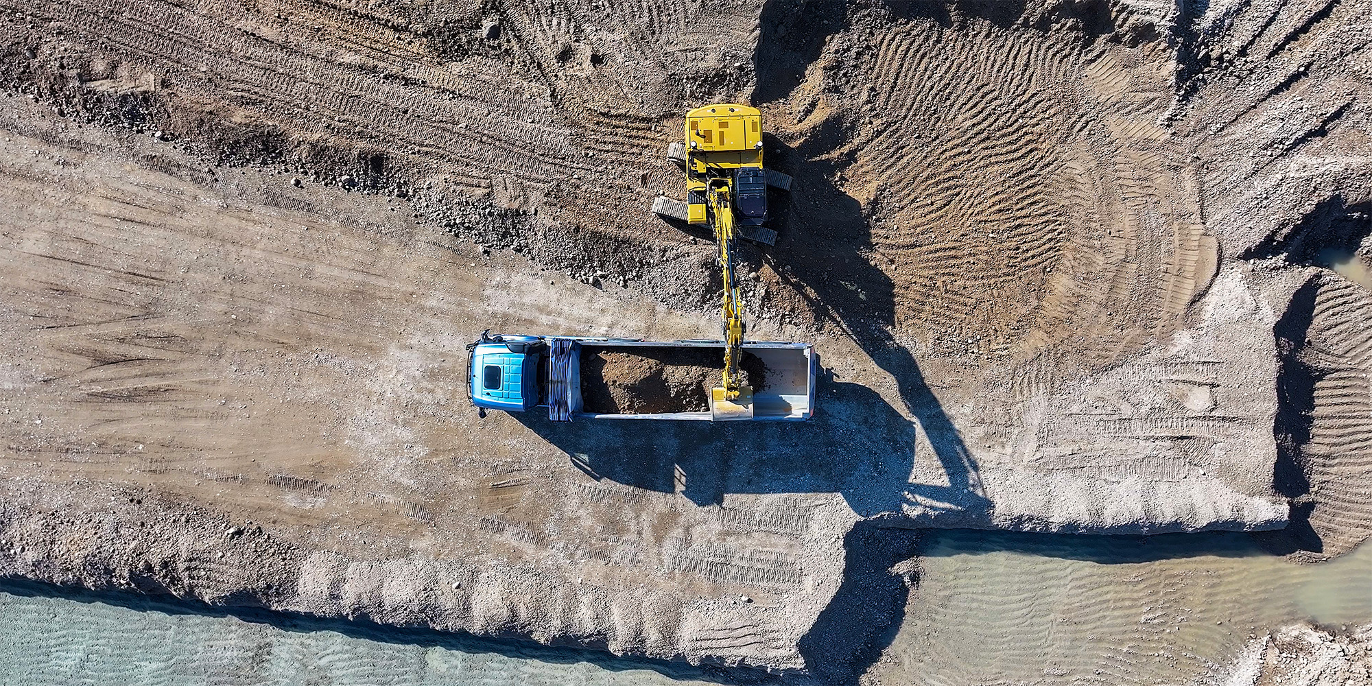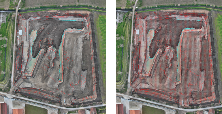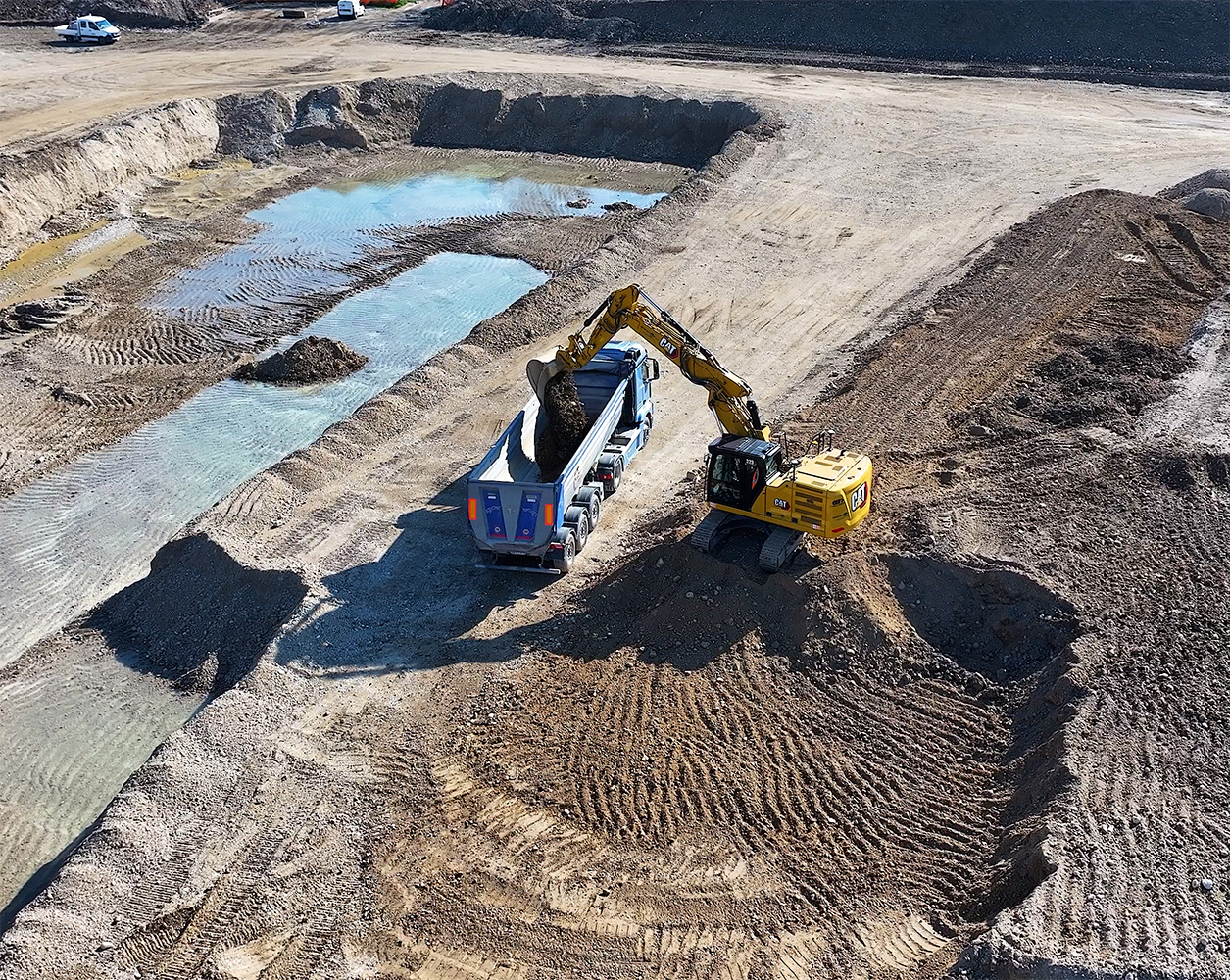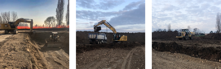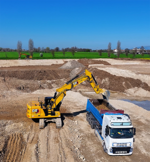 Continua [Poffa]: “La prima macchina sta caricando mistone che poi verrà livellato con la terra per il fondo della vasca; la seconda sta profilando con precisione gli argini, che saranno poi completati con terra e modellazione finale. Utilizzando il sistema satellitare 3D di Caterpillar possiamo eseguire il lavoro con una produttività imbattibile, perché le macchine leggono il progetto direttamente via satellite, caricando i dati dal topografo.”