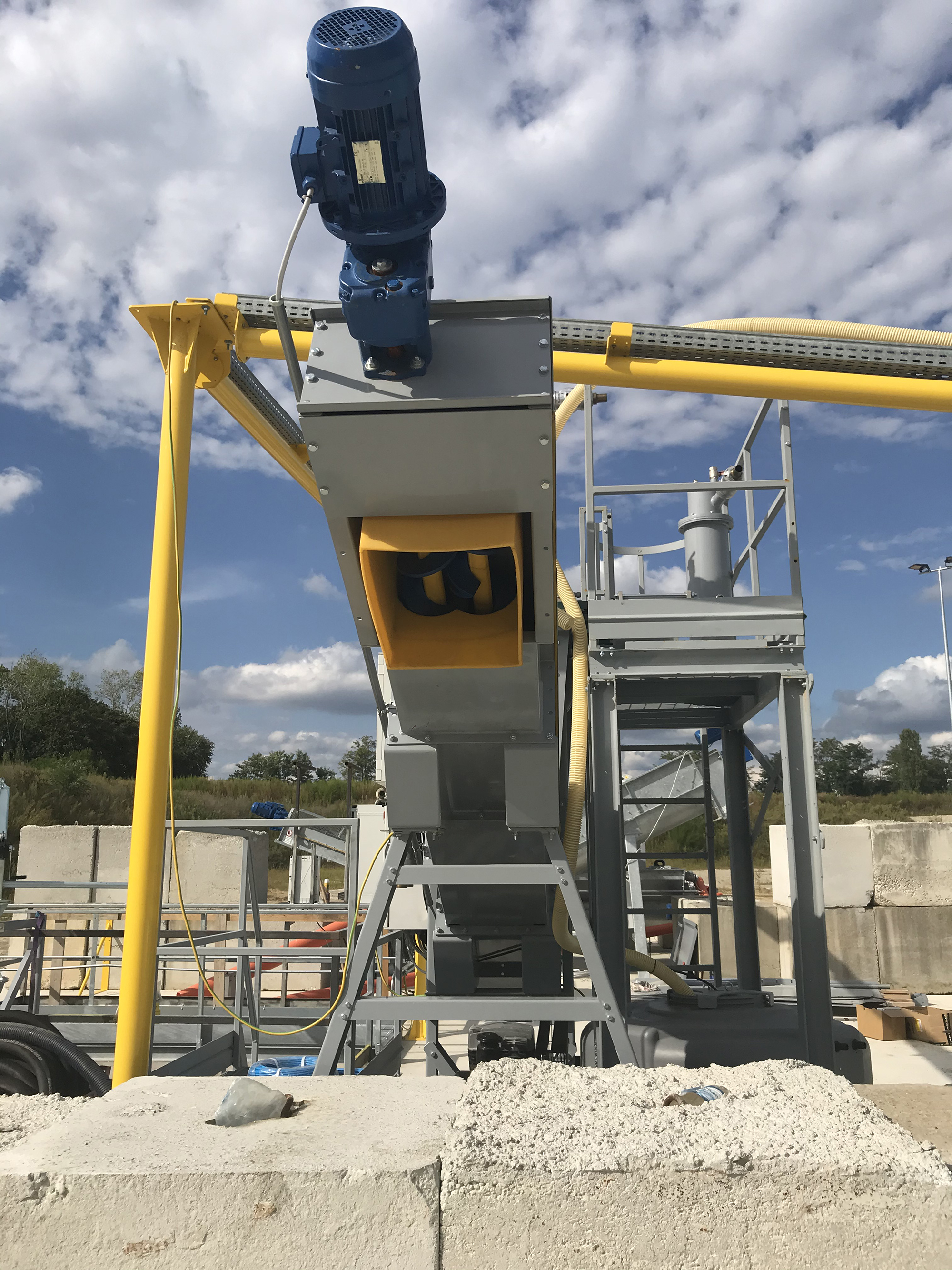 aggregato fine attraversa invece il vaglio e arriva all’interno di una tramoggia nella quale vengono fatte confluire tutte le acque sporche di lavaggio ormai cariche di polvere di cemento e polveri dopo i lavaggi precedenti. Da qui viene trasportato al di fuori con una coclea; durante il trasporto