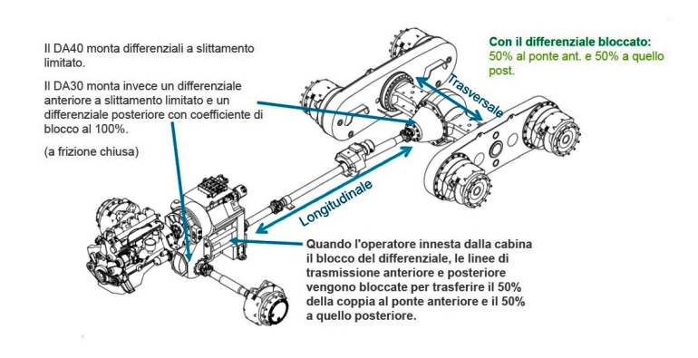 Escluso il motore di cui parliamo a parte e la trasmissione già analizzata, abbiamo un importante scatola di rinvio da cui escono gli alberi di trasmissione che contiene spesso un sistema autobloccante automatico per gestire al meglio la trazione fra anteriore e posteriore. Se verso l’anteriore l’albero è corto, verso il posteriore ci sono distanze importanti e snodo centrale. Bisogna verificare che non ci siano giochi anomali o alberi piegati in quanto normalmente sono anche abbastanza costosi da sostituire.