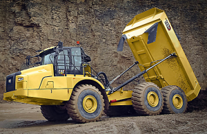 Dumper articolati: 6 ruote di trazione divise su 3 assali, telaio articolato per sterzo e stabilità tra cassone e cabina, tandem ruote posteriori con ampia oscillazione (a volte ponti singoli), cabina centrale anteriore. Grazie a 6 ruote motrici, trasmissioni, sospensioni ed articolazioni al massimo sviluppo, baricentro centrale, il dumper articolato garantisce lavoro su fondi insidiosi e poco preparati garantendo stabilità e sicurezza per l’operatore. Portata/capacità indicativa dalle 15 alle 55 tonnellate o dai 10 ai 35 metri cubi di cassone.