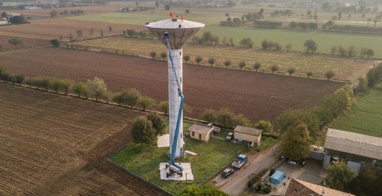 Fino a qualche settimana fa, a chi fosse passato nella campagna di Novagli di Montichiari , non sarebbero potute sfuggire: la piattaforma articolata con braccio in completa estensione, la torre dell’acquedotto e 4 uomini sopra il suo “cappello” a 40 metri di altezza.L’intervento sul serbatoio di compenso, è stato richiesto da A2A, multiutility dei servizi ambientali e teleriscaldamento. La struttura, da tempo non più operativa, necessitava della messa in sicurezza, per impedire che i detriti delle lastre in cemento della copertura – aggredite per anni dagli eventi atmosferici – si staccassero per poi cadere al suolo.