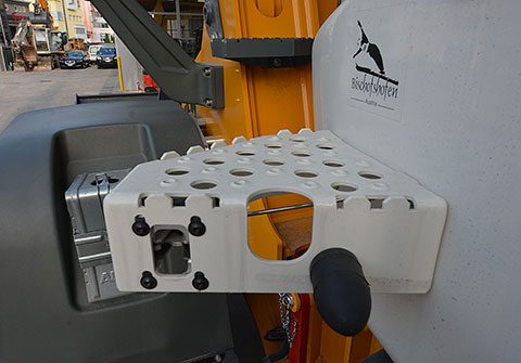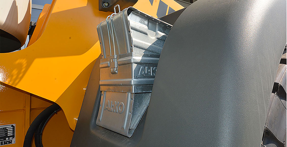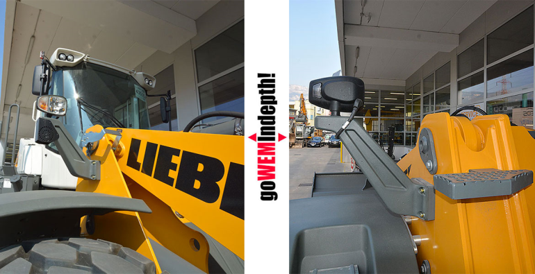 Fari di lavoro e luci di marcia sono collocati su supporti in materiale plastico antiurto di colore grigio scuro con il RAL usato da Liebherr sulle proprie macchine. Anche i parafanghi anteriori sono dello stesso materiale. Una scelta che va nella direzione della qualità sia per il tipo di plastiche utilizzate sia perché non soggette a ruggine nel tempo dopo essere stata colpite dai classici sassolini che precipitano nel normale lavoro quotidiano. Rispetto al classico acciaio garantiscono una durata maggiore ma, per contro, non possono essere riparate, ma solo sostituite.