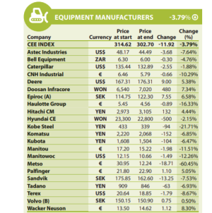 L'OEM con la migliore performance in termini di prezzo delle azioni è stata la società tedesca Wacker Neuson (+8,3%) seguita da vicino dal produttore sudcoreano Doosan Infracore (+7,34%).