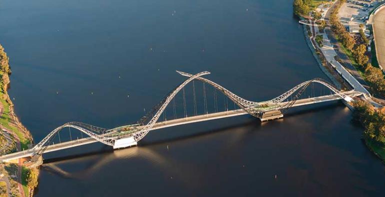 Un team mondiale ha lavorato insieme per costruire l'unico ponte pedonale strallato lungo 370 m a Perth, in Australia.La costruzione e il posizionamento di spettacolari archi in acciaio lunghi 120 m che evocano l'immagine dei cigni e simboleggiano l'armonia tra le comunità indigene e occidentali hanno richiesto un'ampia collaborazione e soluzioni tecniche uniche.