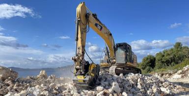 Una benna frantoio MB Crusher al lavoro sull'isola di Meganissi in Grecia
