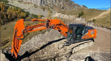 L'escavatore cingolato Hitachi ZX240N tra il Passo Rolle e la Val di Fiemme
